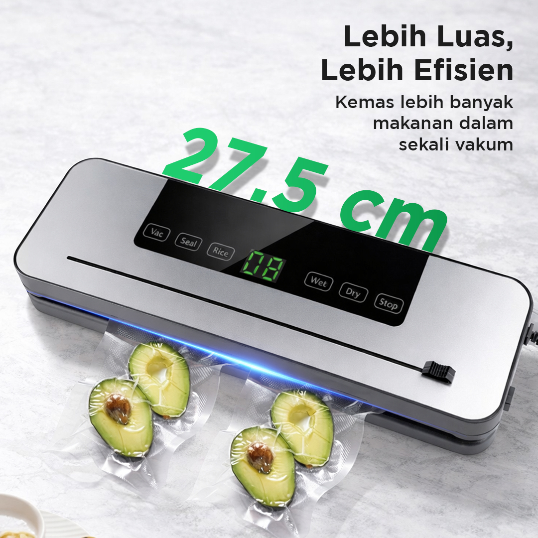 | Lebih Luas, Lebih Efisien Area sealer dengan lebar 27.5 cm membuat Anda dapat mengemas lebih banyak makanan dalam sekali vakum. Cocok untuk penggunaan sehari-hari hingga bisnis kecil. |