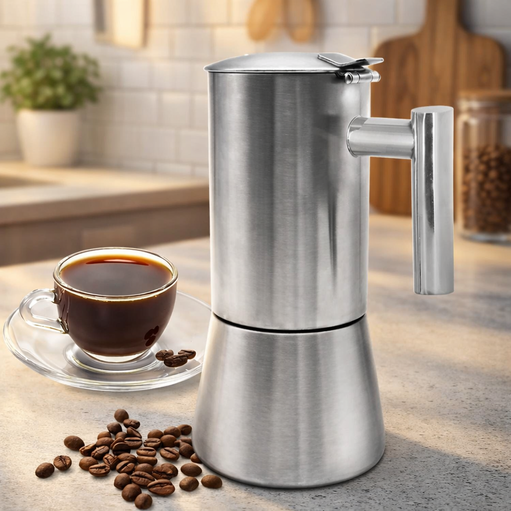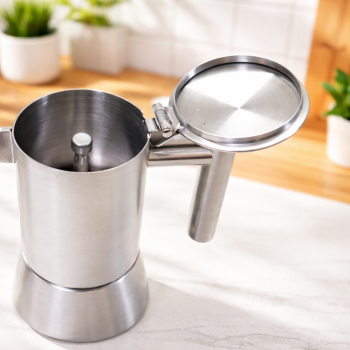 | Material Stainless Steel Berkualitas Tinggi Menggunakan stainless steel premium, moka pot ini kuat, higienis, dan tahan terhadap panas tinggi. Material food grade memastikan rasa kopi tetap murni tanpa bau atau rasa logam yang mengganggu. Selain itu, moka pot stainless steel ini tidak mudah berkarat, mudah dibersihkan, dan cocok untuk penggunaan jangka panjang. Pilihan ideal bagi Anda yang mencari moka pot awet, ekonomis, dan berkualitas tinggi. |