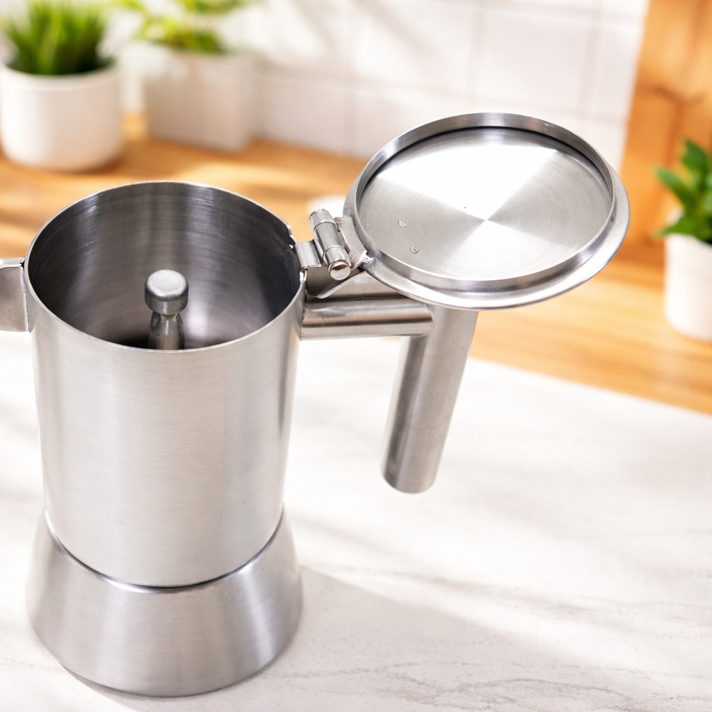 | Penggunaan Mudah dan Cocok untuk Pemula Moka pot stainless steel ini dirancang dengan cara penggunaan yang sederhana, sehingga cocok digunakan oleh pemula tanpa pengalaman barista. Cukup isi air hingga batas katup pengaman, masukkan bubuk kopi giling, lalu pasang dan panaskan di atas kompor. Dalam hitungan menit, kopi espresso akan mengalir ke bagian atas dengan aroma khas ala kafe. Dengan moka pot ini, siapa pun bisa membuat kopi espresso rumahan dengan hasil yang memuaskan. |