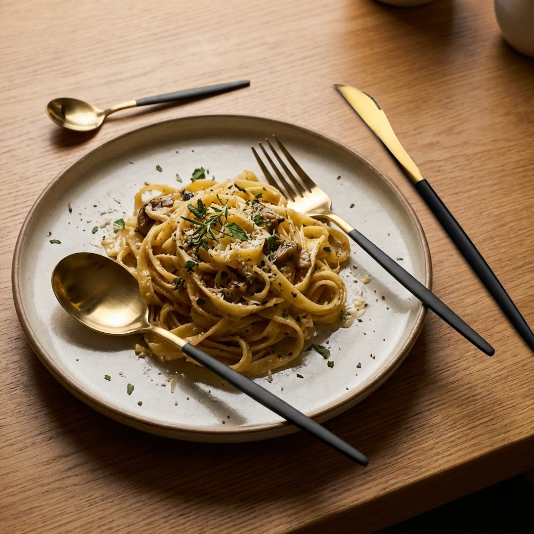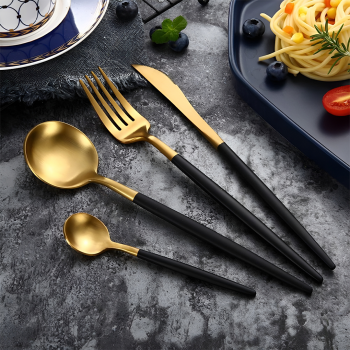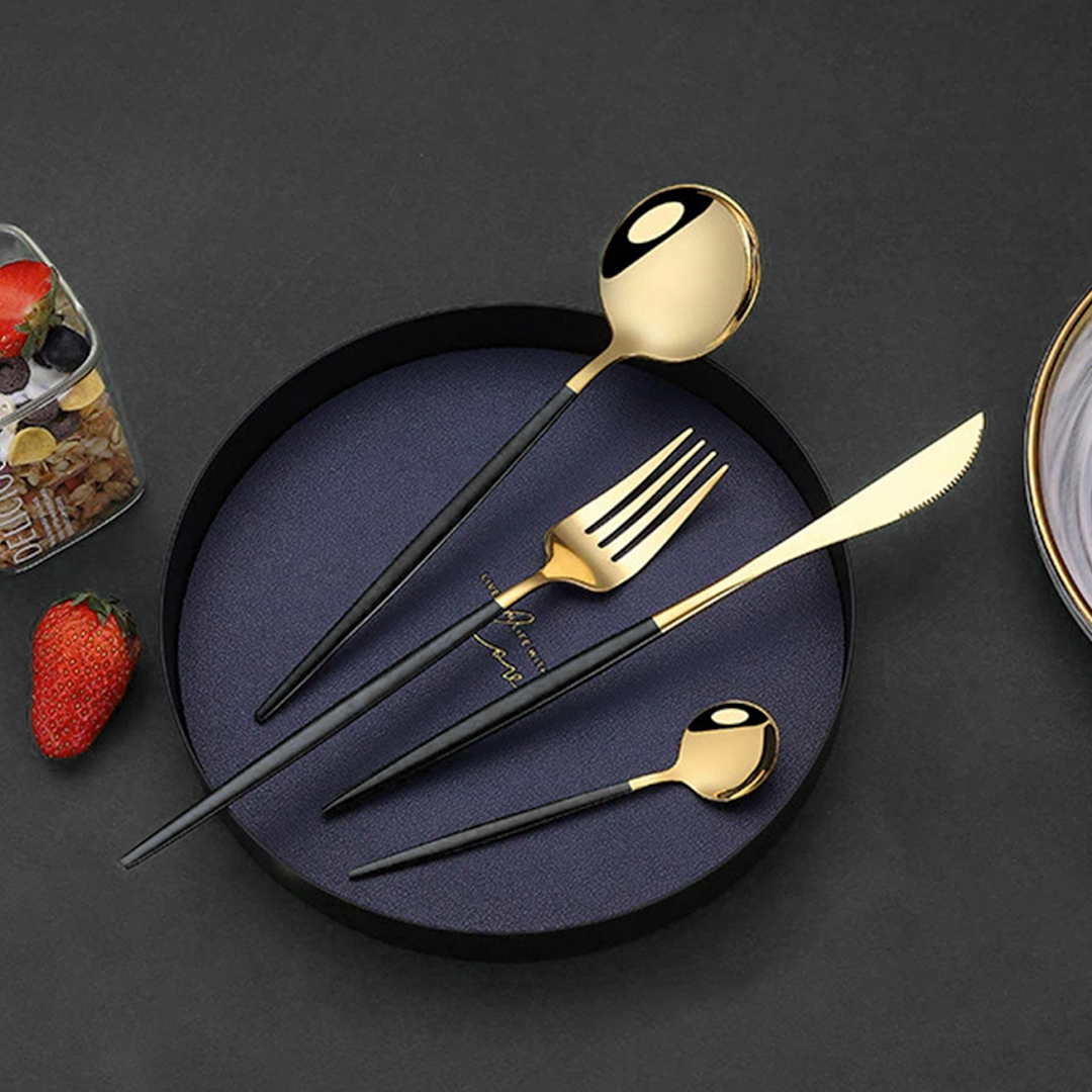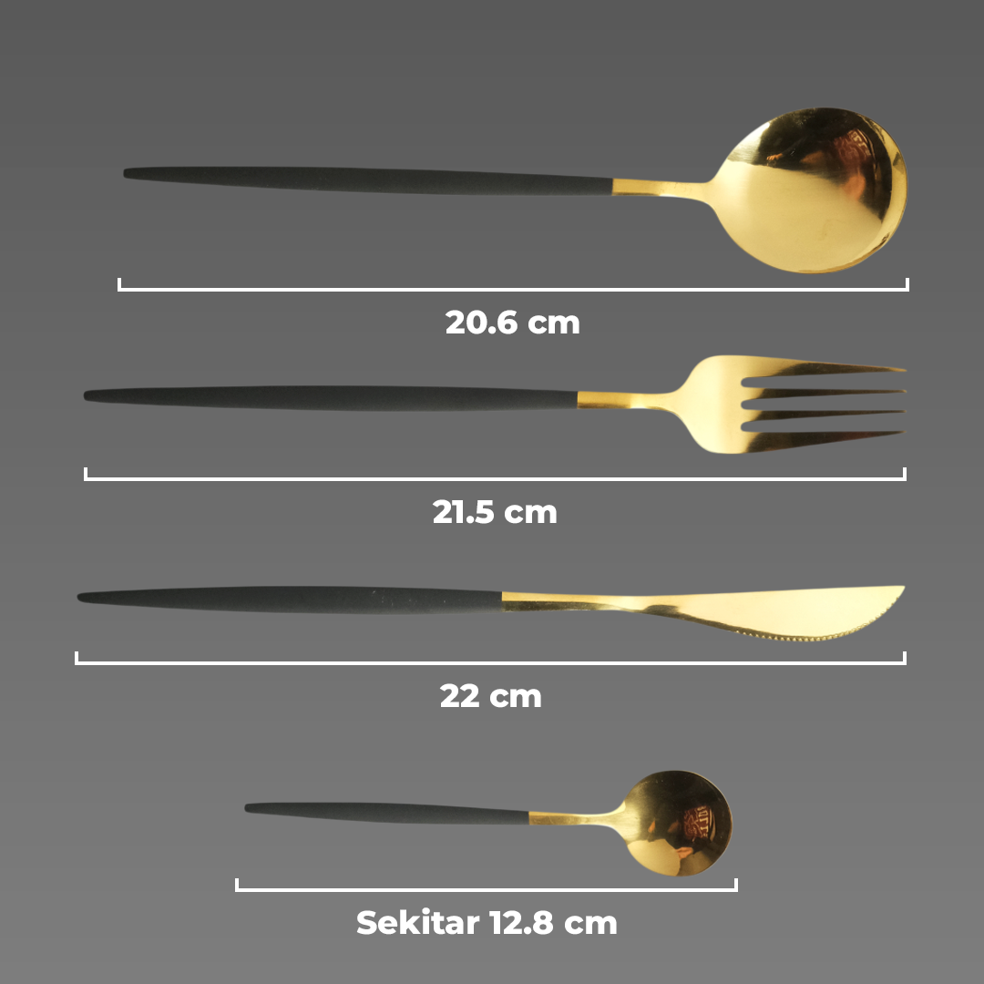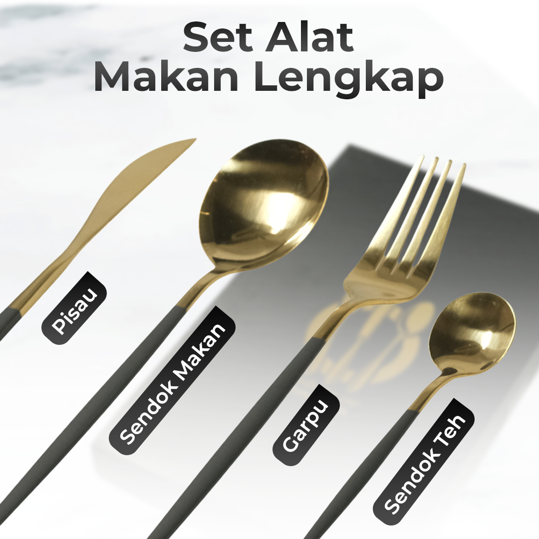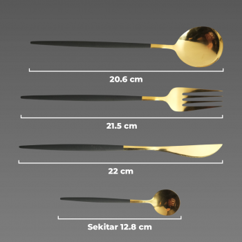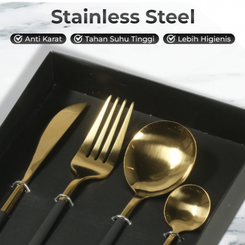 | Desain Elegan Hitam Gold Mengusung konsep desain alat makan elegan dengan kombinasi warna hitam matte dan gold mewah, set alat makan ini memberikan kesan premium di meja makan. Tampilan alat makan stainless steel gold membuat sajian terlihat lebih eksklusif dan menggugah selera. Sangat sesuai digunakan sebagai peralatan makan modern, dekorasi meja makan, atau hadiah istimewa. |