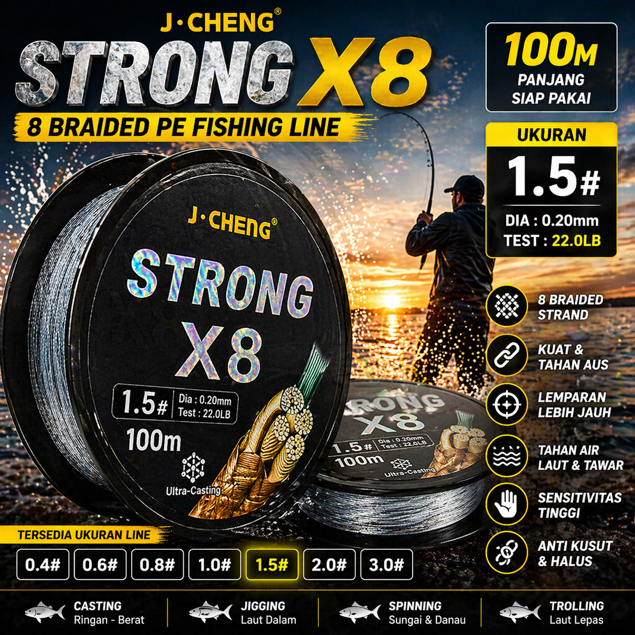 Sering kehilangan ikan karena senar mudah putus, kusut, atau lemparan kurang jauh? Saatnya upgrade ke senar pancing PE braided dari J-Cheng. Menggunakan teknologi 8 helai anyaman PE, senar ini lebih halus, kuat, dan responsif untuk berbagai teknik mancing. Cocok digunakan di sungai, kolam, dan laut untuk hasil strike lebih maksimal.