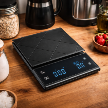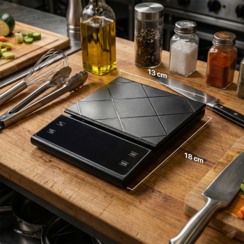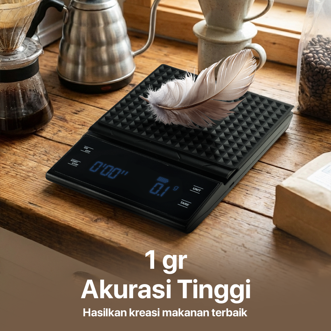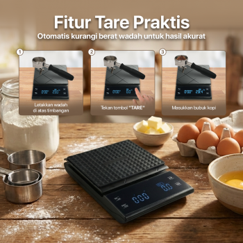 | Fitur Tare Praktis Timbangan secara otomatis mengurangi berat wadah agar hasil pengukuran lebih akurat. Cocok untuk membuat kopi yang butuh presisi tinggi. |