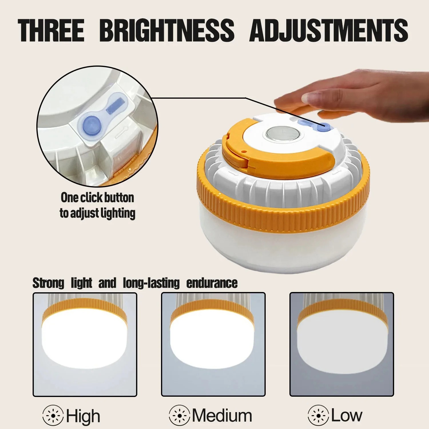 | Bebas Atur Kecerahan Lampu LED camping ini dibekali 3 tingkat kecerahan yang bisa Anda pilih sesuai dengan kebutuhan. Atur kecerahan dengan menekan tombol yang tersedia mulai dari low, medium, hingga high. |
