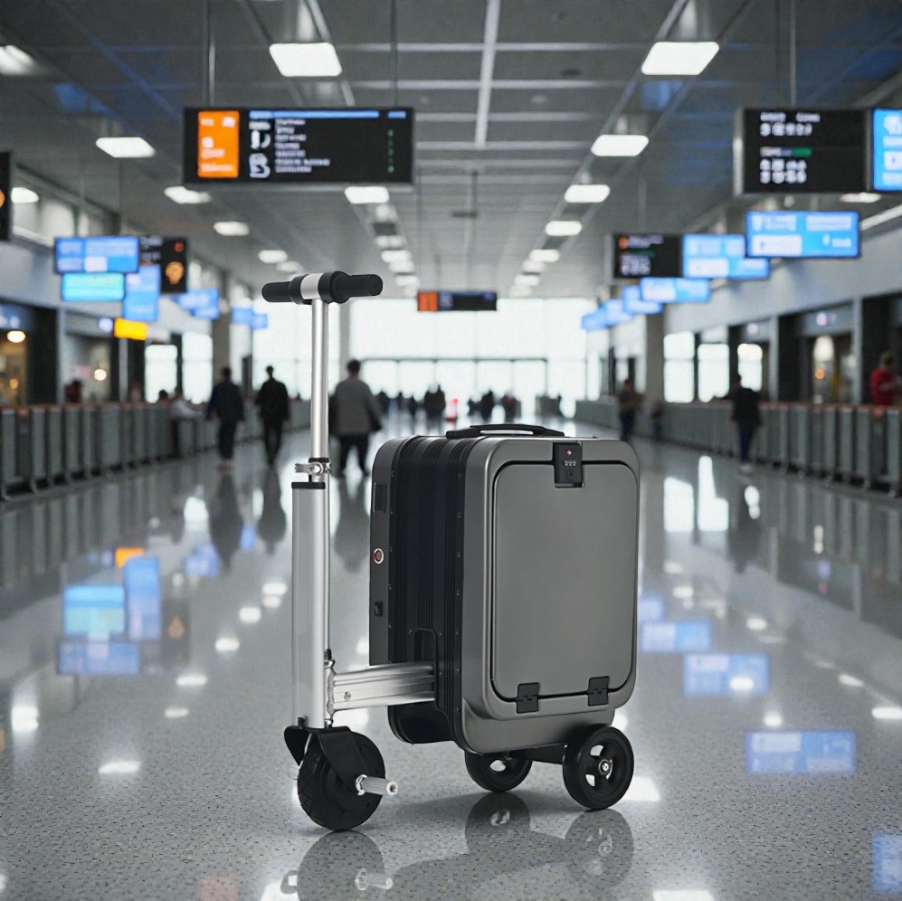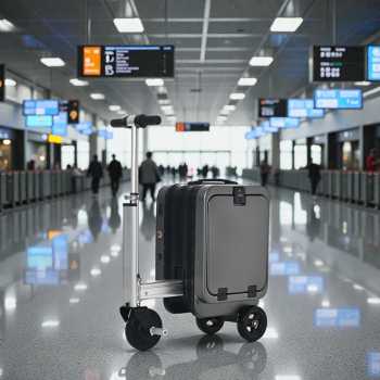 | Desain Ride-On Modern ala Smart Luggage Global Dari segi desain, koper ini mengadopsi konsep smart luggage ride-on yang banyak ditemukan pada koper skuter kelas atas seperti koper Airwheel. Posisi duduk ergonomis, setang nyaman digenggam, serta kontrol gas dan rem terintegrasi membuat pengguna mudah beradaptasi. Desain ini mendukung mobilitas cepat tanpa mengorbankan kenyamanan dan keamanan. |