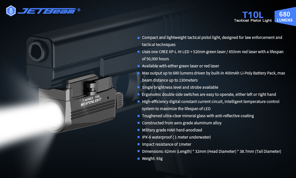 Untuk penembakan yang akurat, maka pencahayaan yang memadai perlu Anda dapatkan. Itulah mengapa Anda harus menggunakan senter pistol T10L dari JETBeam. Dirancang khusus untuk senjata dengan 9 mm atau picatinny rails. Senter ini mampu memberikan Anda cahaya putih dan laser sejauh 130 M. Warna lasernya juga bisa Anda pilih antara merah atau hijau pada kolom varian. Soal daya tahan tak perlu diragukan, struktur dan materialnya telah disesuaikan dengan aktivitas taktis yang intens.