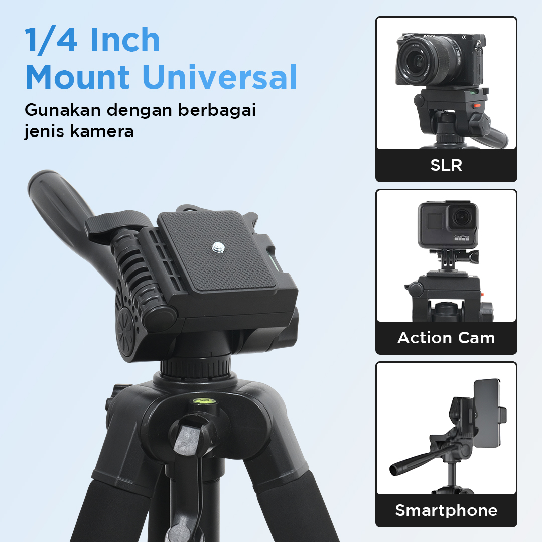 | Gunakan dengan Berbagai Action Cam Mount universal pada membuat tripod kompatibel dengan aneka jenis dan model kamera. Mulai dari kamera SLR, action cam, hingga kamera smartphone, Anda bisa menggunakan tripod ini untuk mengambil foto dengan berbagai perangkat. |
