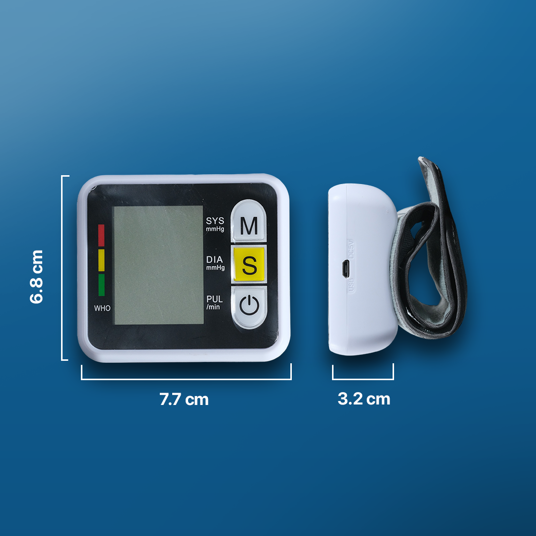 Kotak Penyimpanan: 8.5 x 8.5 x 7.5 cm Tensimeter Digital: 7.7 x 3.2 x 6.8 cm Panjang Kabel Micro USB: 30 cm Ukuran Lingkar Pergelangan Tangan: 13.5-19.5 cm Jarak Antara Tepi Bawah Alat dan Pergelangan Tangan: 1-1.5 cm