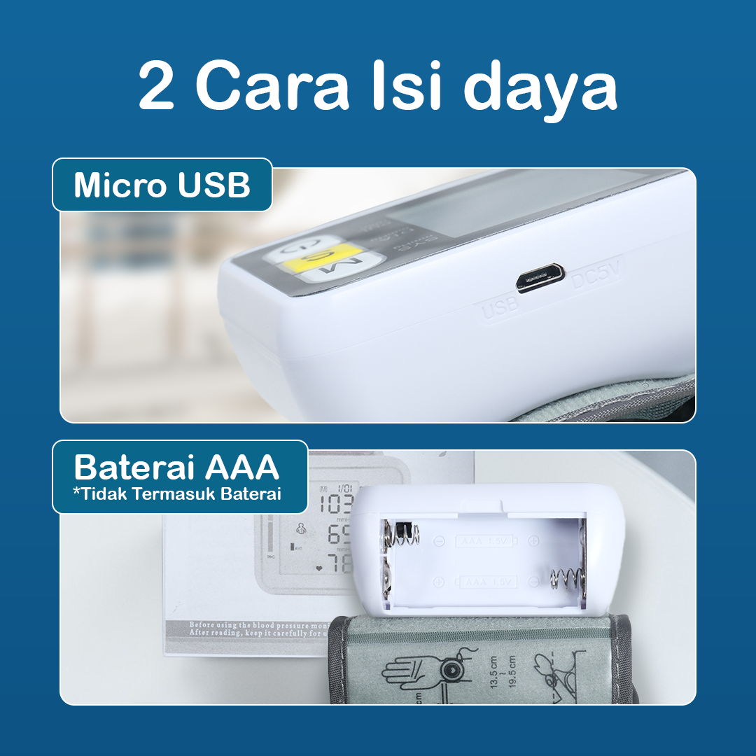 Tensimeter digital ini mendukung dua sumber daya, yaitu baterai AAA dan kabel micro USB. Anda tetap bisa menggunakan alat meski baterai habis dengan opsi kabel USB. Sangat fleksibel untuk penggunaan di rumah maupun saat traveling. Tidak perlu khawatir kehabisan daya saat dibutuhkan.