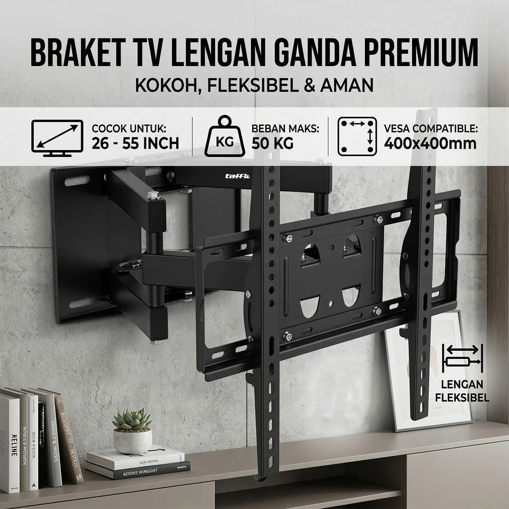 Jika Anda membutuhkan bracket TV yang dapat digerakkan ke kanan dan ke kiri dengan leluasa, maka Anda dapat menggunakan bracket yang satu ini. TV dan monitor layar datar berukuran 26-55 Inch dapat dipasang dengan baik. Terbuat dari material baja kokoh yang dapat menahan beban TV secara maksimal. Sudut menonton TV kini dapat diatur dengan mudah untuk mendukung sesi bersantai Anda.