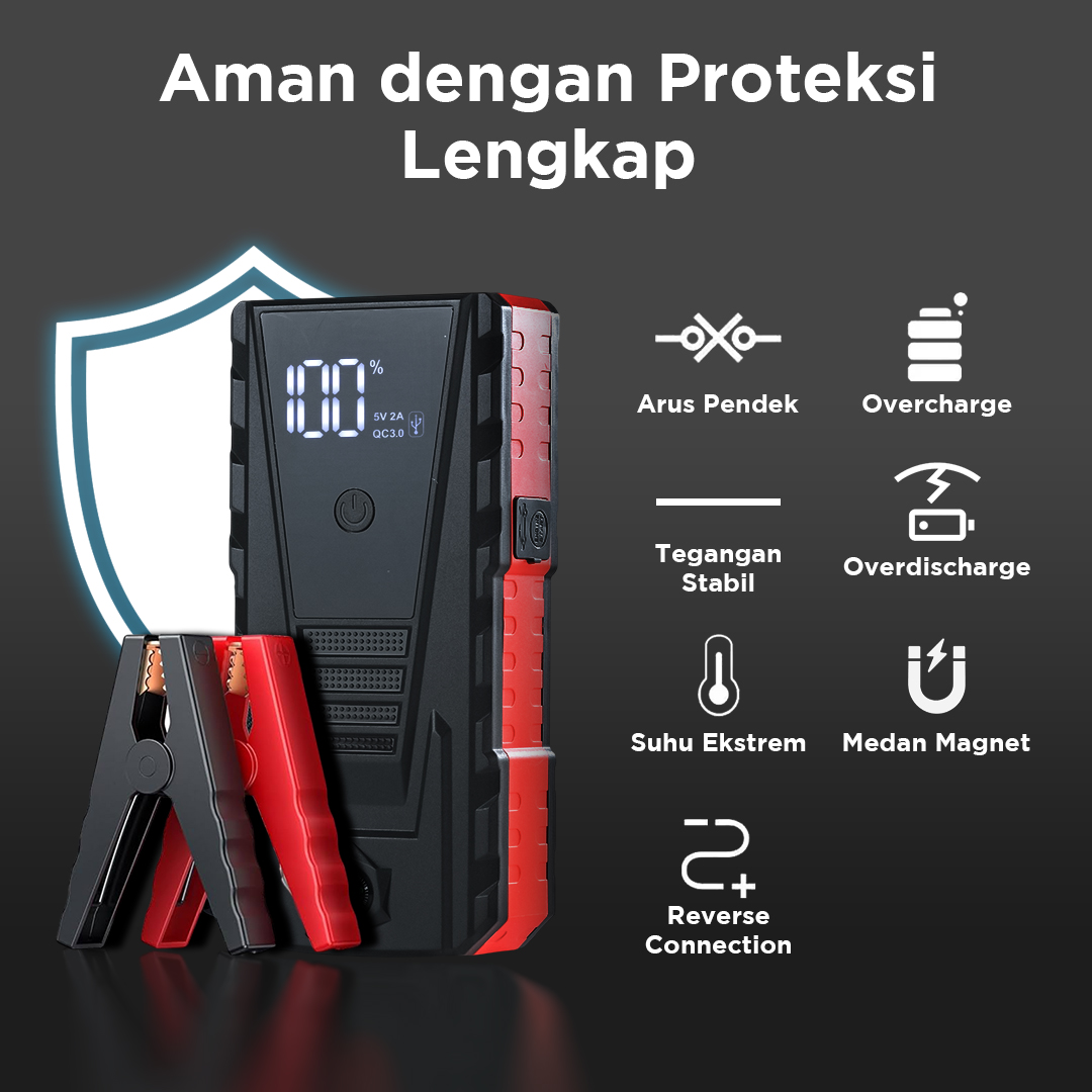 | Aman dengan Proteksi Lengkap Fitur proteksi lengkap memastikan proses menyalakan mobil tetap aman. Mulai dari proteksi arus pendek hingga medan, kini Anda dapat menyalakan mobil mogok tanpa khawatir terjadi korsleting. |