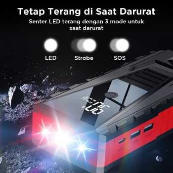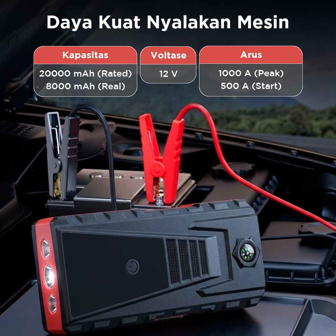| Daya Kuat Nyalakan Mesin Menawarkan kapasitas rated 20000 mAh dan real 8000 mAh, jumper aki ini dapat menghasilkan arus hingga 1000 A untuk menyalakan mesin mobil yang mati. Kini Anda dapat langsung menghidupkan mesin mobil hanya dengan 1 alat saja. |