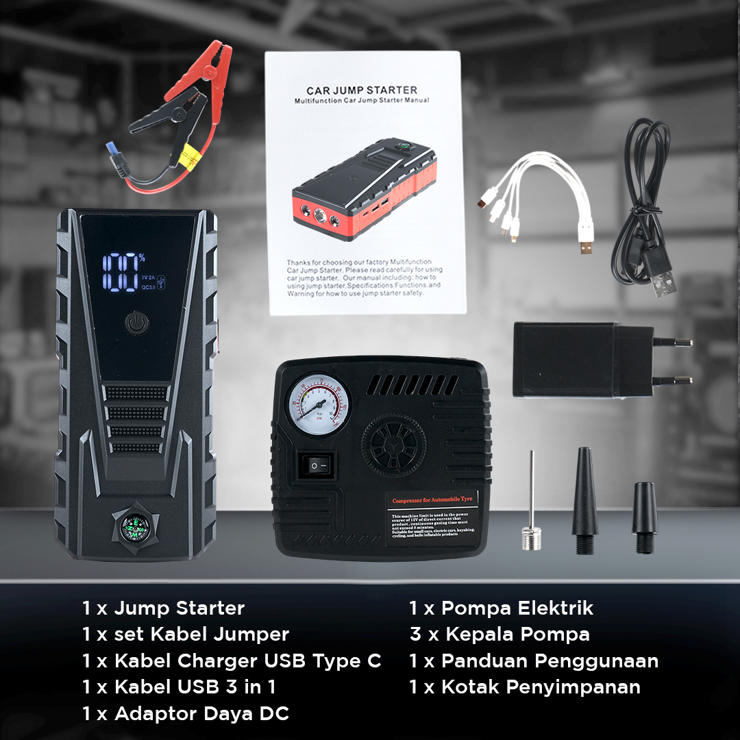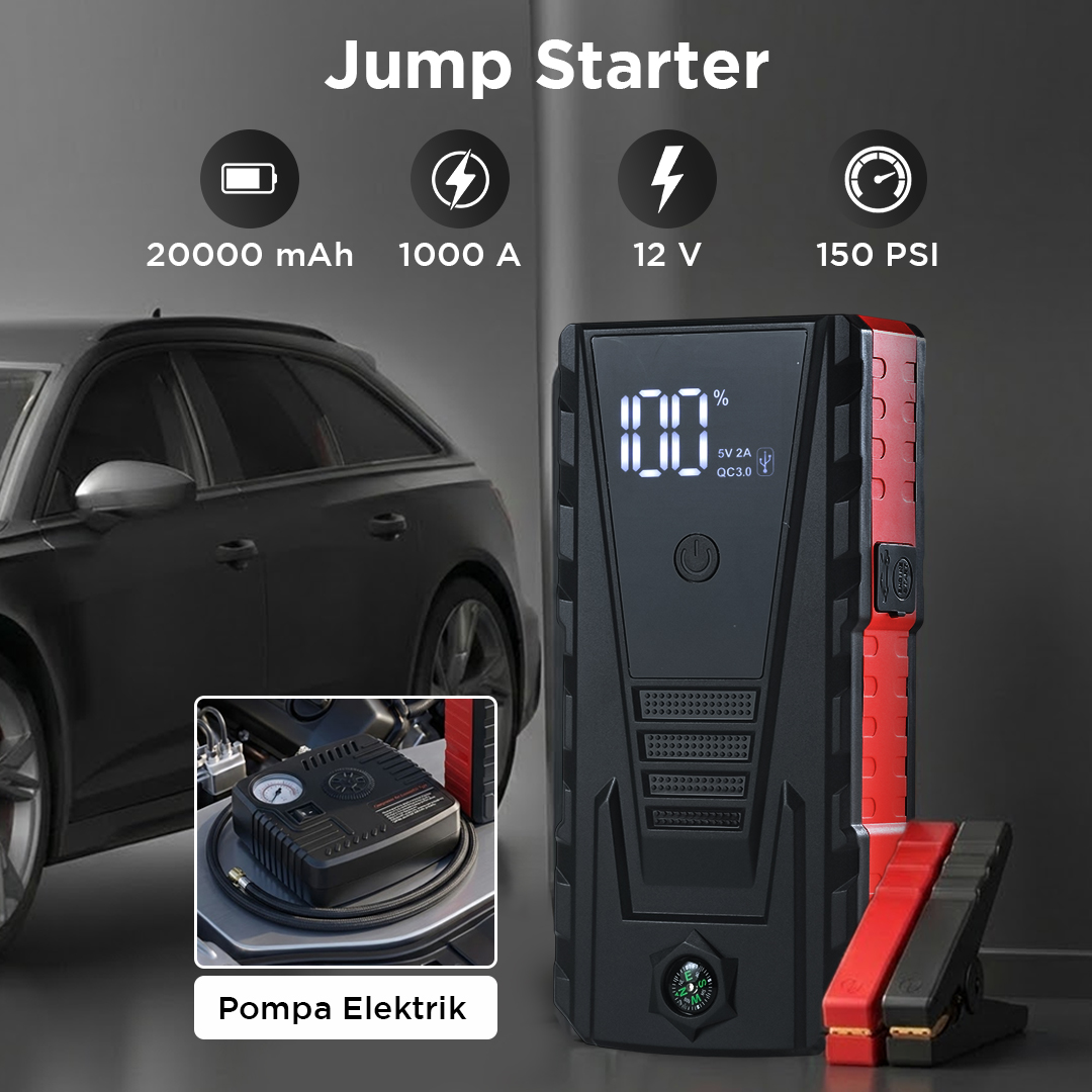 Menyalakan daya mobil yang mati atau mogok kapan saja semakin mudah dengan jump starter mobil dari JXIANG POWER. Dibekali kapasitas besar 20000 mAh, jump starter dapat hidupkan daya mobil dengan sistem kelistrikan 12 V. Hadir sebagai produk multifungsi, Anda juga dapat digunakan sebagai power bank hingga senter di saat darurat. Lengkap dengan pompa ban elektrik yang bisa digunakan untuk mengisi angin ban kapan saja.