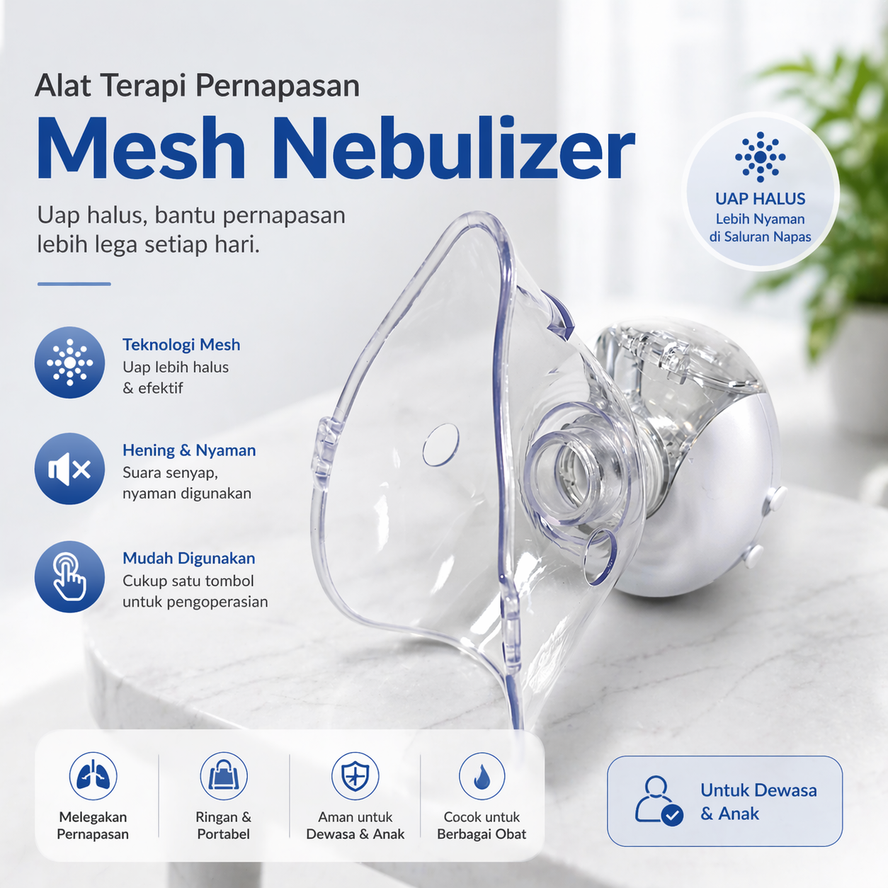 | Partikel Uap Halus Lebih Efektif Mengubah cairan obat menjadi uap halus yang mudah dihirup dan diserap tubuh. Membantu obat di nebulizer mencapai saluran pernapasan dengan lebih optimal. Tidak terasa kasar saat digunakan. Cocok untuk berbagai kondisi pernapasan. |