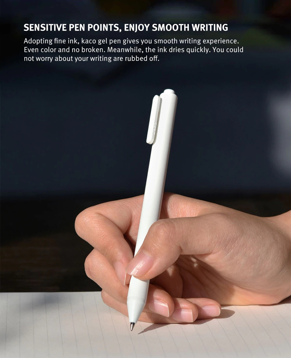 | 			 Titik Pena Sensitif, Nikmati Tulisan Halus 			Mata pena ini sangat sensitive sehingga Anda dapat menulis dan tanda tangan dengan sangat halus. Menulis tidak akan melelahkan dengan menggunakan pena Kaco ini berkat tinta pena yang cepat kering membuat Anda dapat menulis dengan cepat tanpa perlu khawatir tulisan Anda akan memudar saat terkena tangan.