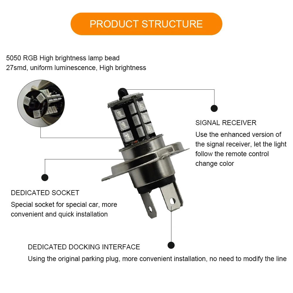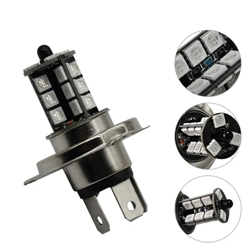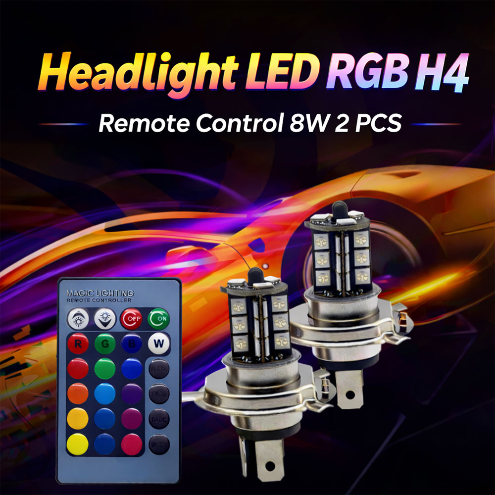 Upgrade mobil Anda dengan lampu depan mobil LED H4 RGB 12 V 27 LED 5050 SMD (800 lumen), hadir dengan 16 warna dan 5 mode via remote 5 M. Dilengkapi CANBUS error free anti kedip, material aluminium tahan panas hingga 50.000 jam. Menggunakan soket H4 standar, cukup lepas lampu lama lalu pasang langsung tanpa perlu ubah kabel, cocok untuk lampu depan, lampu kabut, DRL, hingga lampu parkir.