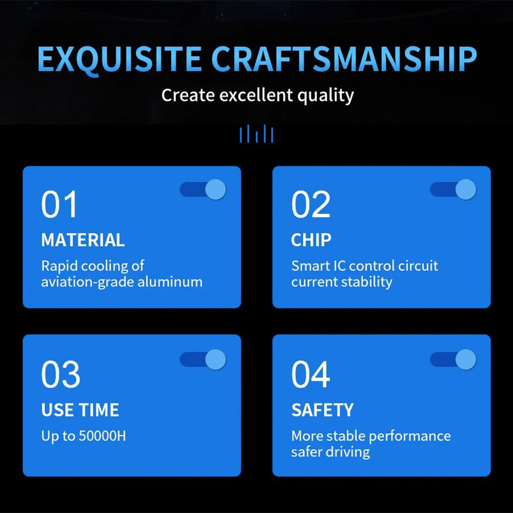 | Material Aviation Aluminium Material lampu dibuat dari aluminium aviation grade yang memiliki kemampuan penghantar panas sangat baik. Panas dari LED akan langsung dibuang sehingga suhu tetap stabil saat digunakan. Hal ini membuat umur lampu lebih panjang hingga lebih dari 50.000 jam pemakaian. |