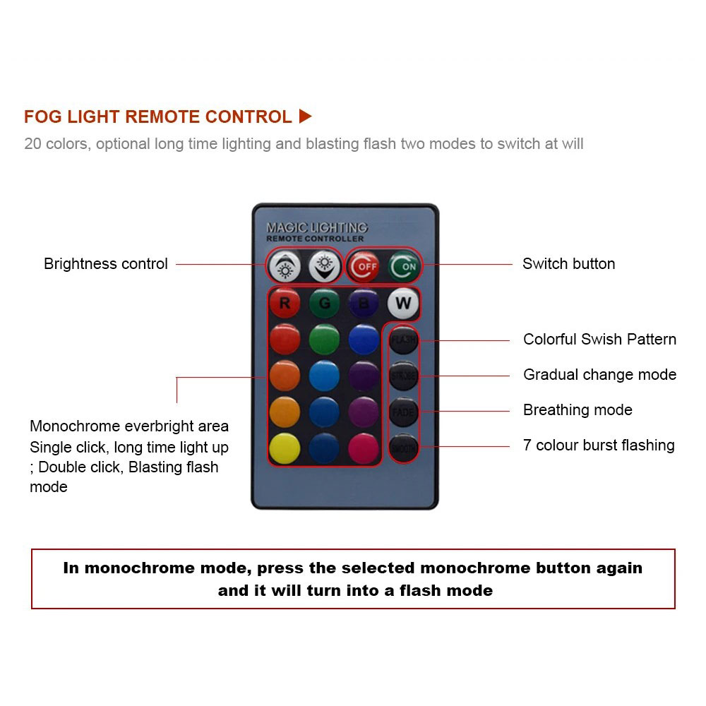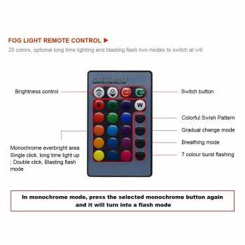 | Teknologi LED RGB 5050 SMD Lampu ini menggunakan 27 chip LED tipe 5050 SMD yang dikenal memiliki tingkat pencahayaan lebih stabil dan efisien. Cahaya yang dihasilkan mencapai 800 lumen sehingga cukup terang untuk menunjang visibilitas sekaligus estetika kendaraan. Dengan susunan LED yang merata, warna terlihat lebih hidup dan tidak belang. |