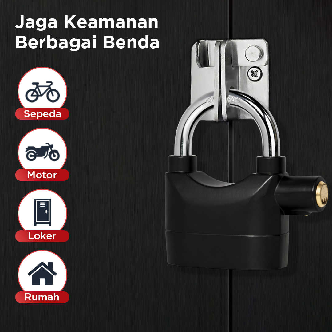 | Jaga Keamanan Berbagai Benda Hadir sebagai produk multifungsi, gunakan gembok alarm untuk menjaga keamanan beragai benda. Pasang pada sepeda, motor, loker, hingga pagar rumah untuk cegah maling atau pembobolan. |