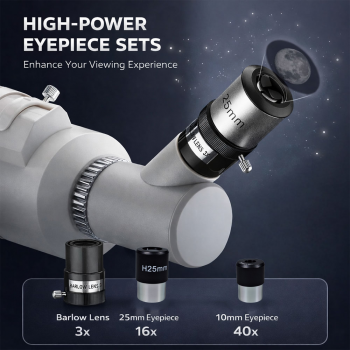 | Perbesaran Hingga 120 X dengan Multi Eyepiece Teleskop ini menggunakan sistem optik refractor yang dikenal menghasilkan gambar lebih tajam dan minim distorsi. Sistem ini sangat cocok untuk pemula karena tidak memerlukan banyak penyesuaian. Pengguna bisa langsung menikmati pengamatan dengan hasil yang jelas. Selain itu, refractor telescope lebih tahan terhadap perubahan posisi dan mudah digunakan di berbagai kondisi. Cocok digunakan untuk melihat bulan, bintang, maupun objek darat. |