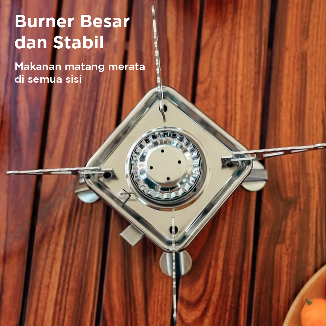 | Burner Besar dengan Nyala Api Stabil Nikmati proses memasak yang sempurna tanpa khawatir makanan menjadi gosong atau matang tidak merata. Kompor gas portable ini dibekali burner besar yang dirancang untuk menyebarkan panas ke seluruh permukaan alat masak secara optimal. Dengan nyala api biru yang super panas dan stabil, Anda bisa memasak berbagai menu dengan hasil yang memuaskan. |