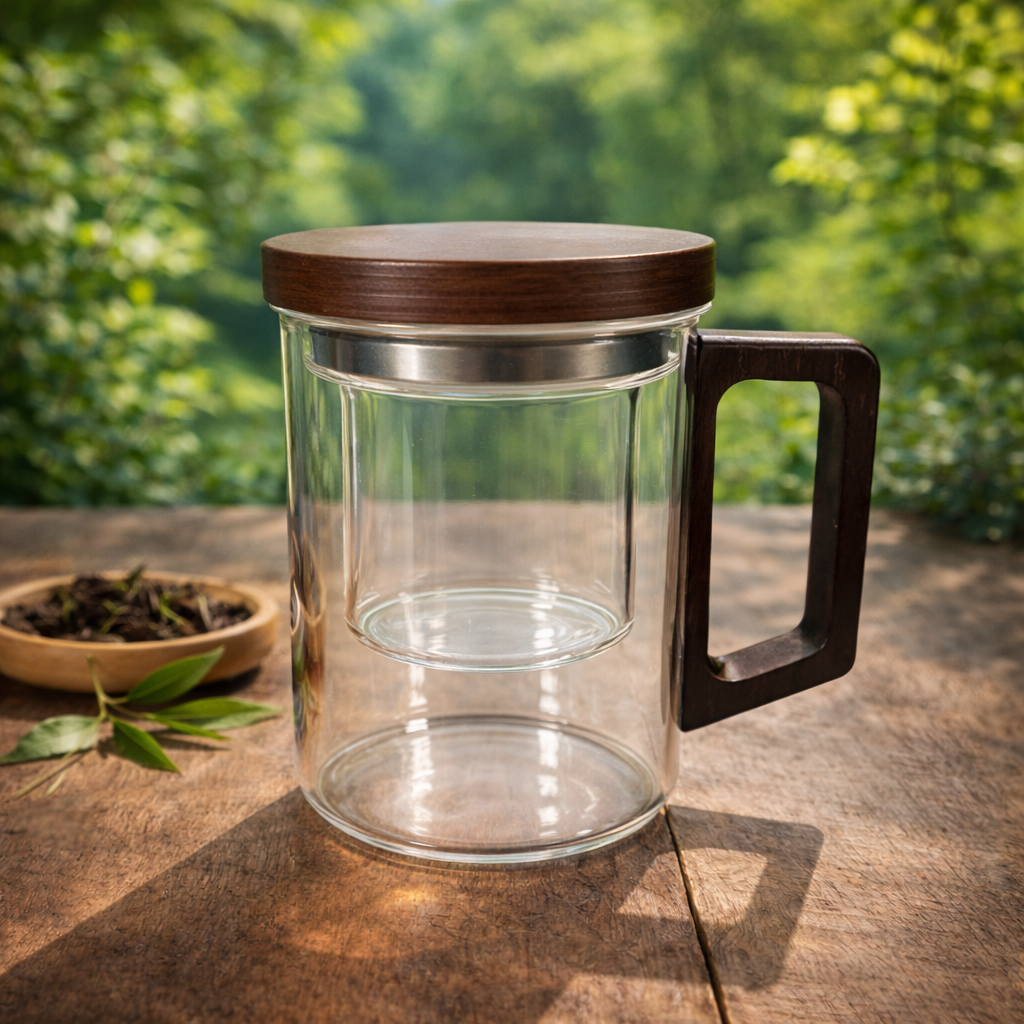 Nikmati seduhan teh yang lebih bersih menggunakan cangkir teh infuser dari kaca borosilikat dari KSO. Dilengkapi saringan lepas-pasang, tutup kayu, serta desain tahan panas, cangkir ini cocok digunakan sebagai infuser mug untuk teh, kopi, maupun infused water. Desainnya yang elegan juga membuat cangkir ini nyaman digunakan baik di rumah, kantor, maupun saat bersantai.