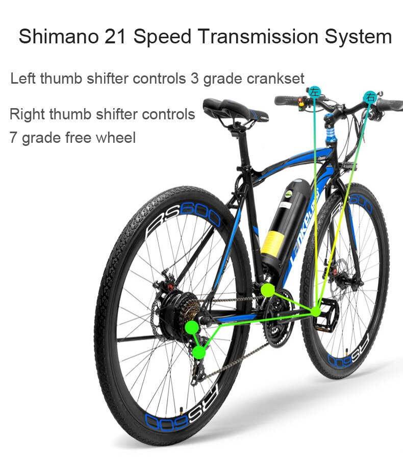 | 			 Sistem Transmisi Kecepatan Shimano 21 Gigi 			Kayuh dengan nyaman di berbagai medan berkat sistem transmisi 21 speed Shimano. 3 grade crankset dan 7 grade free wheel dapat diatur sesuai kontur dan tenaga Anda. Buat perjalanan makin efisien sekaligus menjaga daya tahan komponen sepeda listrik gunung Lankeleisi RS600.