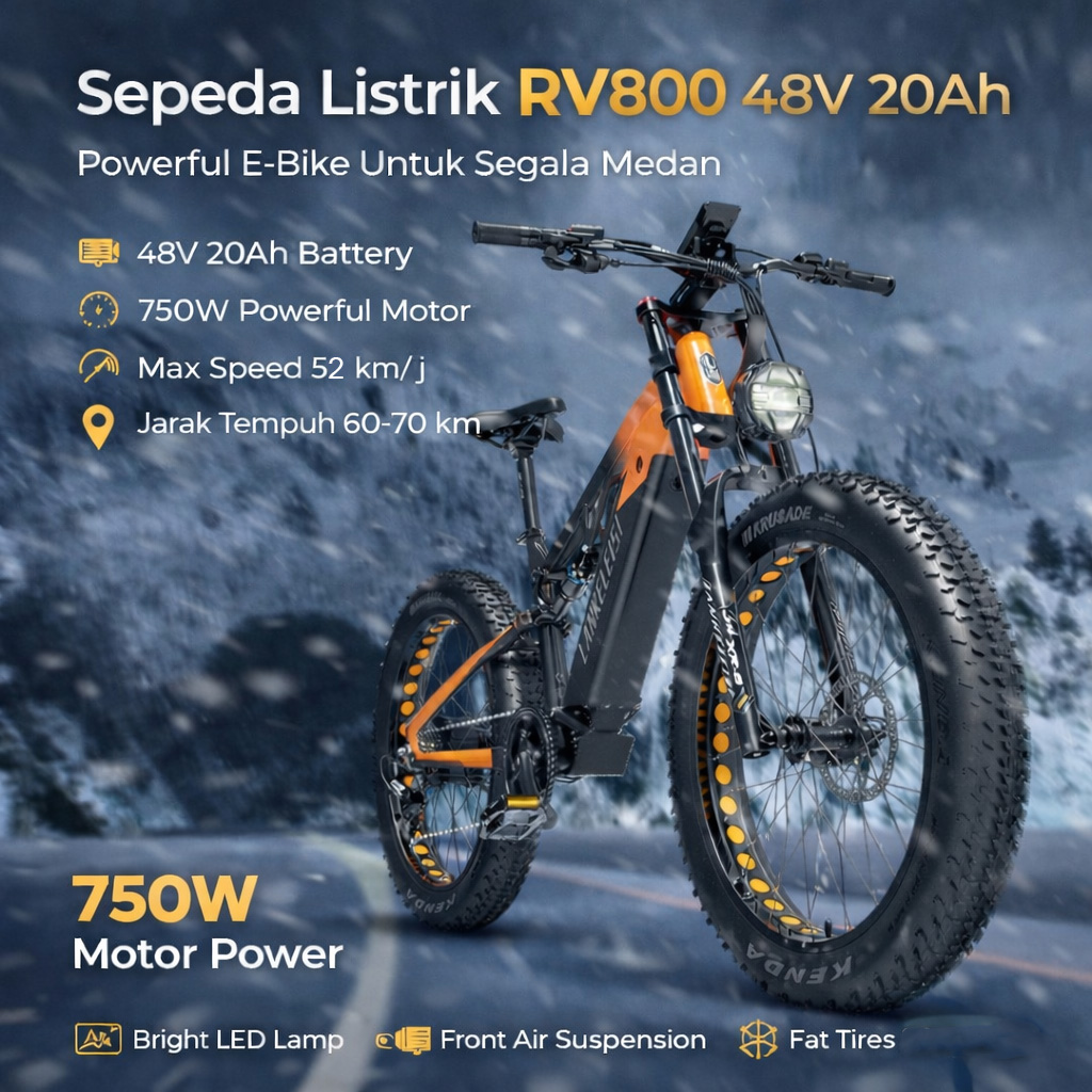 Lankeleisi kembali menghadirkan sepeda listrik terbaru dengan motor bertenaga. Sepeda listrik seri RV800 Plus mengusung model fat bike dengan ciri khas ban yang besar. Meski punya ban besar, bukan berarti daya gowesnya menjadi lebih berat. Sokongan tenaga listrik dan motor 750 W dari BAFANG membuat Anda tak cepat lelah, bahkan ketika menaiki tanjakan sekali pun. Sepeda ini juga sudah dilengkapi rem cakram, baterai berkapasitas 20 Ah, fork suspensi, dan frame aluminium alloy 6061 sehingga siap Anda ajak bertualang.