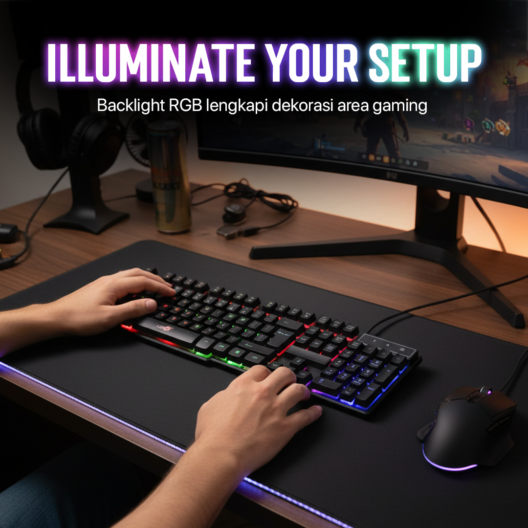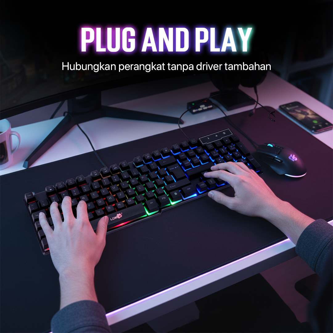 | Plug and Play Praktis Sistem plug and play membuat Anda dapat langsung menghubungkan gaming keyboard tanpa aplikasi tambahan. Cukup pasang pada port USB PC atau laptop dan keyboard siap digunakan. |