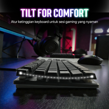 | Gaming Lebih Nyaman Stand pada bagian bawah keyboard dapat dibuka untuk sesuaikan ketinggian keyboard untuk waktu gaming yang lebih nyaman. Tak ada tangan yang lelah atau kaku selama bermain game. |