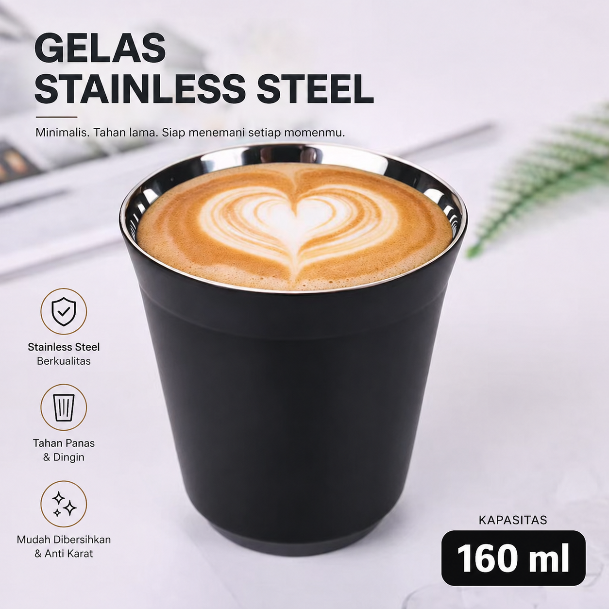 Nikmati minuman panas dan dingin dengan nyaman menggunakan gelas stainless steel 304 double layer dari Leeseph. Desain anti panas di luar, aman dipegang, mudah dibersihkan, dan cocok untuk kopi, espresso, susu, hingga minuman dingin. Tersedia ukuran 80 ml dan 160 ml.