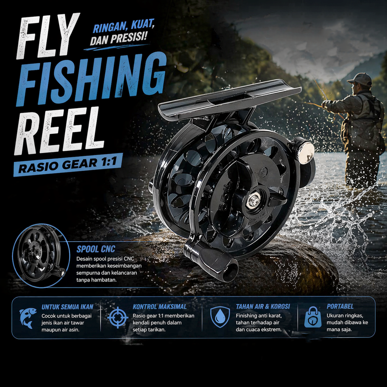 | Gear Ratio 1:1 Presisi Tinggi Rasio gear 1:1 memberikan kontrol gulungan langsung tanpa percepatan berlebih. Sangat cocok untuk teknik fly fishing yang membutuhkan feeling dan akurasi saat retrieve. Membantu Anda mengatur line dengan lebih presisi. |