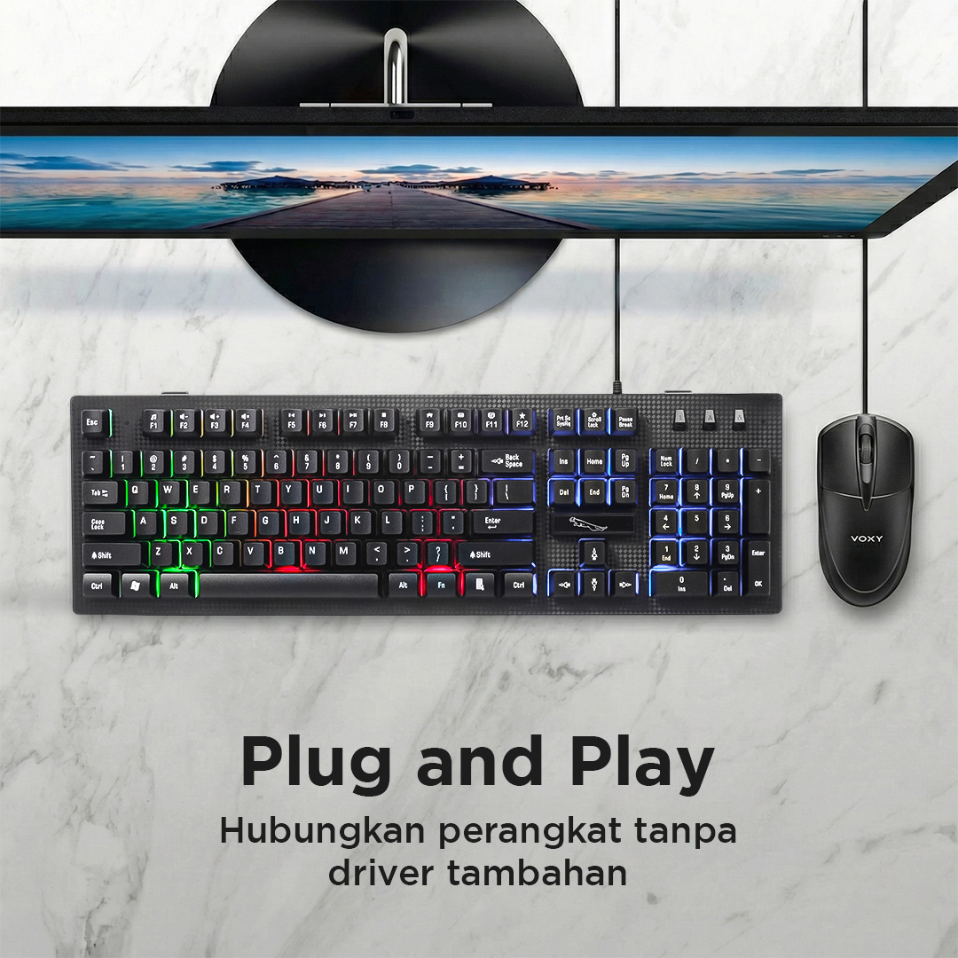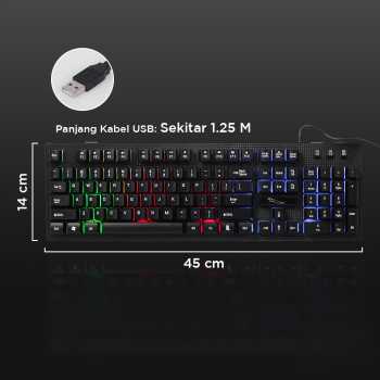 | Plug and Play Praktis Sistem plug and play membuat Anda dapat langsung menghubungkan gaming keyboard tanpa aplikasi tambahan. Cukup pasang pada port USB PC atau laptop dan keyboard siap digunakan. |