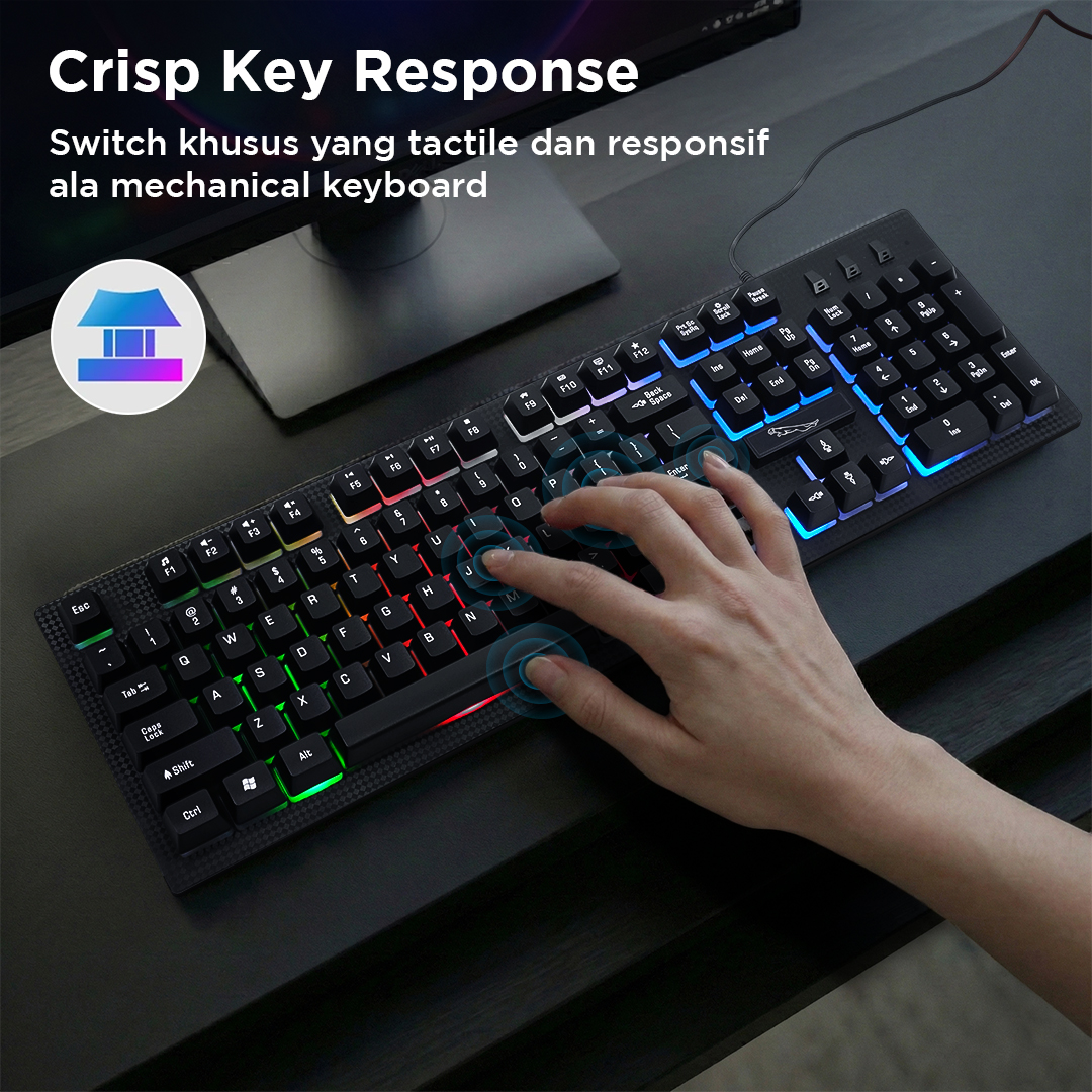 | Respon Gesit Khas Gaming Dibekali switch khusus, gaming keyboard dapat memberikan respon yang cepat. Rebounrd yang kuat hasilkan feel tactile khas mechanical keyboard. |