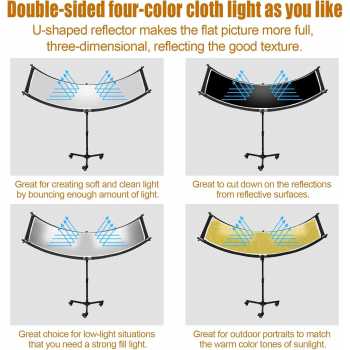 | Hasilkan Beragam Efek Cahaya Atasi masalah pencahayaan yang terlalu gelap, terlalu terang, atau kurang merata dengan reflektor cahaya. Pantulan cahaya dari matahari atau lampu studio dapat dimanipulasi sesuai kebutuhan fotografi. Terlebih lagi reflektor ini menawarkan 4 warna reflektor untuk hasil yang berbeda, yakni: