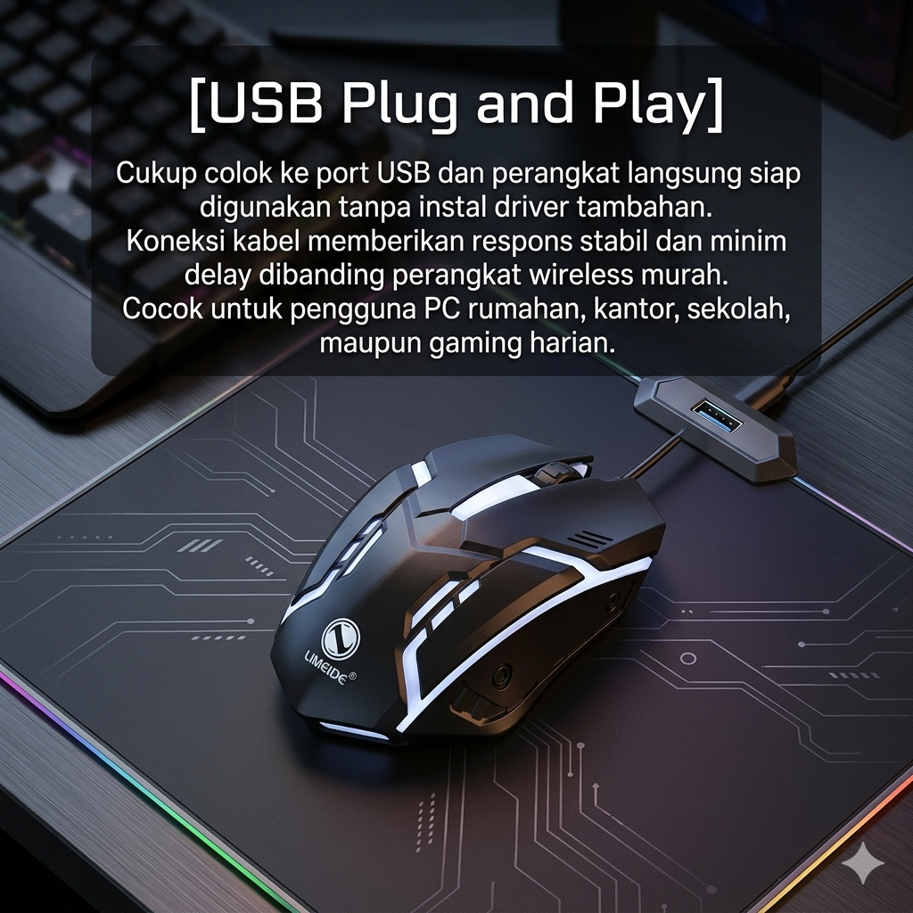 | USB Plug and Play Cukup colok ke port USB dan perangkat langsung siap digunakan tanpa instal driver tambahan. Koneksi kabel memberikan respons stabil dan minim delay dibanding perangkat wireless murah. Cocok untuk pengguna PC rumahan, kantor, sekolah, maupun gaming harian. |