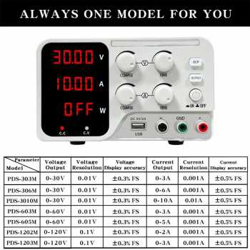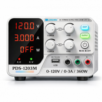 LONG WEI PDS-1203M power supply linear dengan rentang tegangan hingga 120 V dan arus maksimal 3 A, menghasilkan daya 360 W. Menggunakan sistem CV (Constant Voltage) dan CC (Constant Current) transisi otomatis, power supply mampu menjaga stabilitas output perubahan beban (load regulation) dan fluktuasi input (line regulation). Dilengkapi 4 digit LED display untuk monitoring dan fitur OCP (Over Current Protection). Cocok untuk kebutuhan laboratorium, teknisi service profesional, pengujian modul daya, risel elektronik hingga pengembangan sistem berbasis DC high voltase.