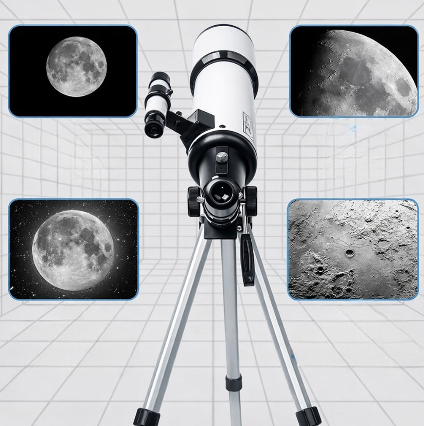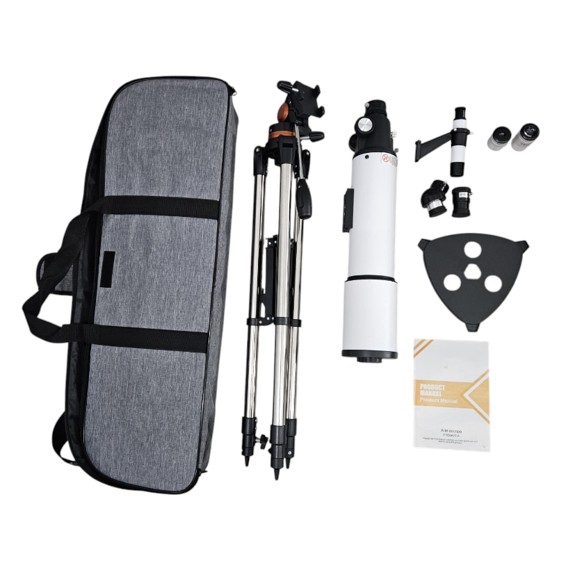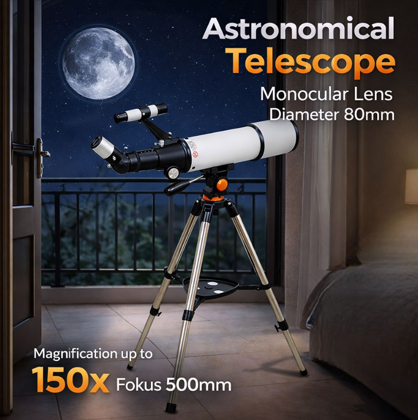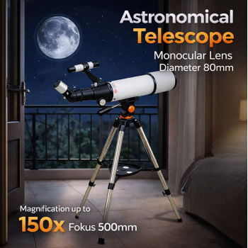 Teleskop Astronomi dari LUXUN memiliki diameter lensa objektif 80 mm dan panjang fokus 500 mm. Dirancang untuk pemula hingga penggemar astronomi, teleskop ini mampu menampilkan citra bulan, planet, dan bintang dengan kejernihan tinggi. Badan tabung terbuat dari aluminium alloy yang ringan namun kokoh, dilengkapi tripod baja antikarat yang stabil, serta paket aksesori lengkap siap pakai.