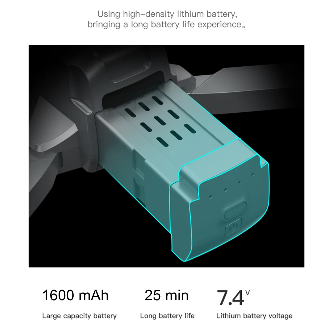 | Baterai Tahan Lama Ditenagai baterai 1600 mAh, drone ini menawarkan waktu terbang yang stabil dan efisien untuk sesi pemotretan atau perekaman selama 25 menit. Sistem manajemen daya yang cerdas membantu menjaga performa dan umur baterai. |