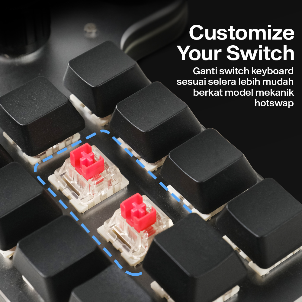 | Hotswap Switch Lebih Fleksibel Keyboard ini mengadopsi fitur hotswap yang memungkinkan pengguna mengganti switch tanpa harus membongkar seluruh perangkat. Dengan fitur ini, macro keypad mechanical dapat disesuaikan dengan preferensi pengguna sesuai jenis switch yang diinginkan. |