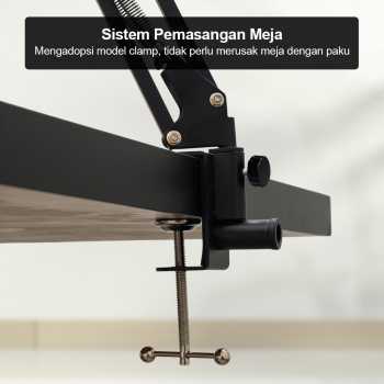 | Sistem Pemasangan Meja Tidak perlu merusak meja dengan paku karena lazypod ini mengadopsi model clamp. Anda bisa menjepitkan clampnya ke bagian tepi meja, tiang silinder, atau papan ranjang. Ketebalan media pemasangan juga universal karena ukuran clamp yang cukup lebar. |