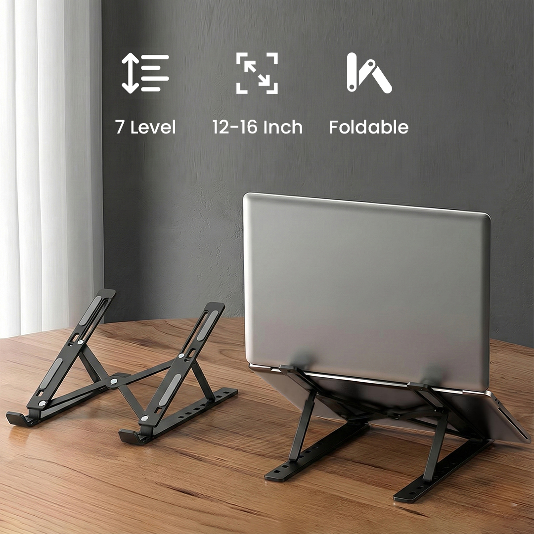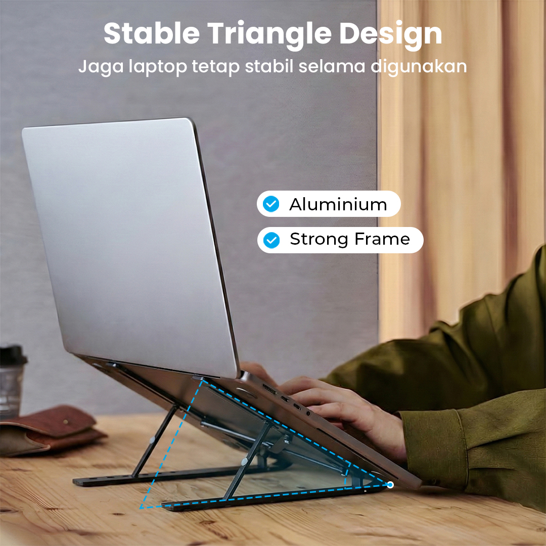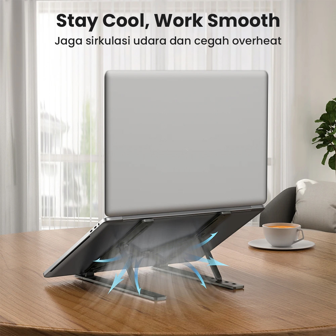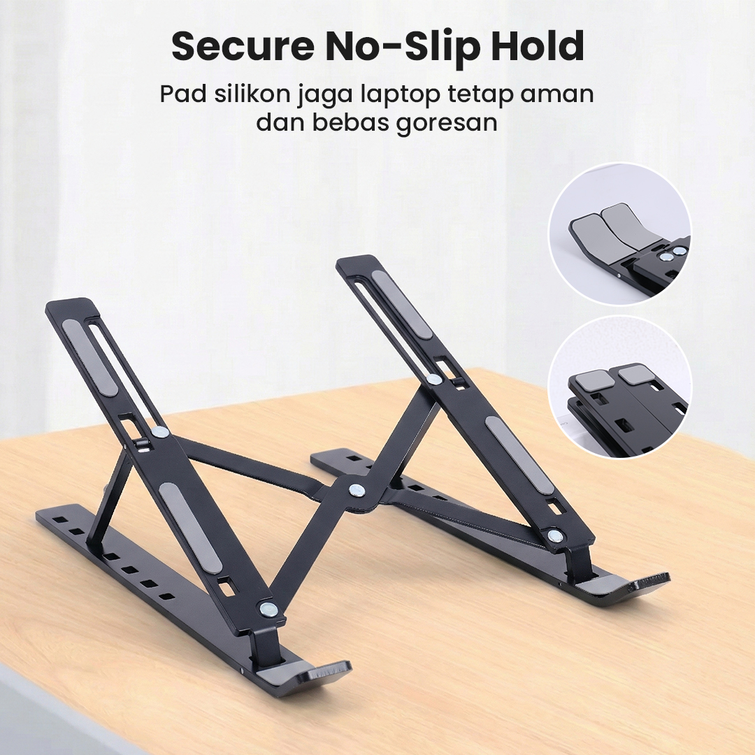 | Desain Ergonomis dan Stabil Desain ergonomis dengan kemiringan yang pas, pad silikon anti slip, dan material aluminium dapat menopang laptop dengan maksimal. Ini yang memastikan stand laptop tetap stabil. |