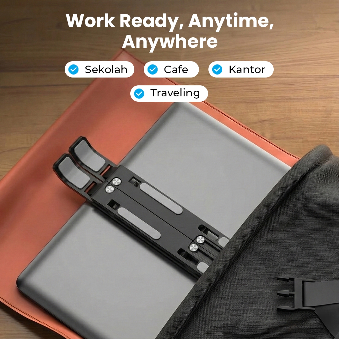 | Bawa dan Gunakan Kapan Saja Model lipat ringkas membuat laptop stand MC jadi perlengkapan kerja wajib saat WFA atau WFC. Bawa dan gunakan stand laptop untuk bekerja dengan nyaman kapan saja dan di mana saja. |