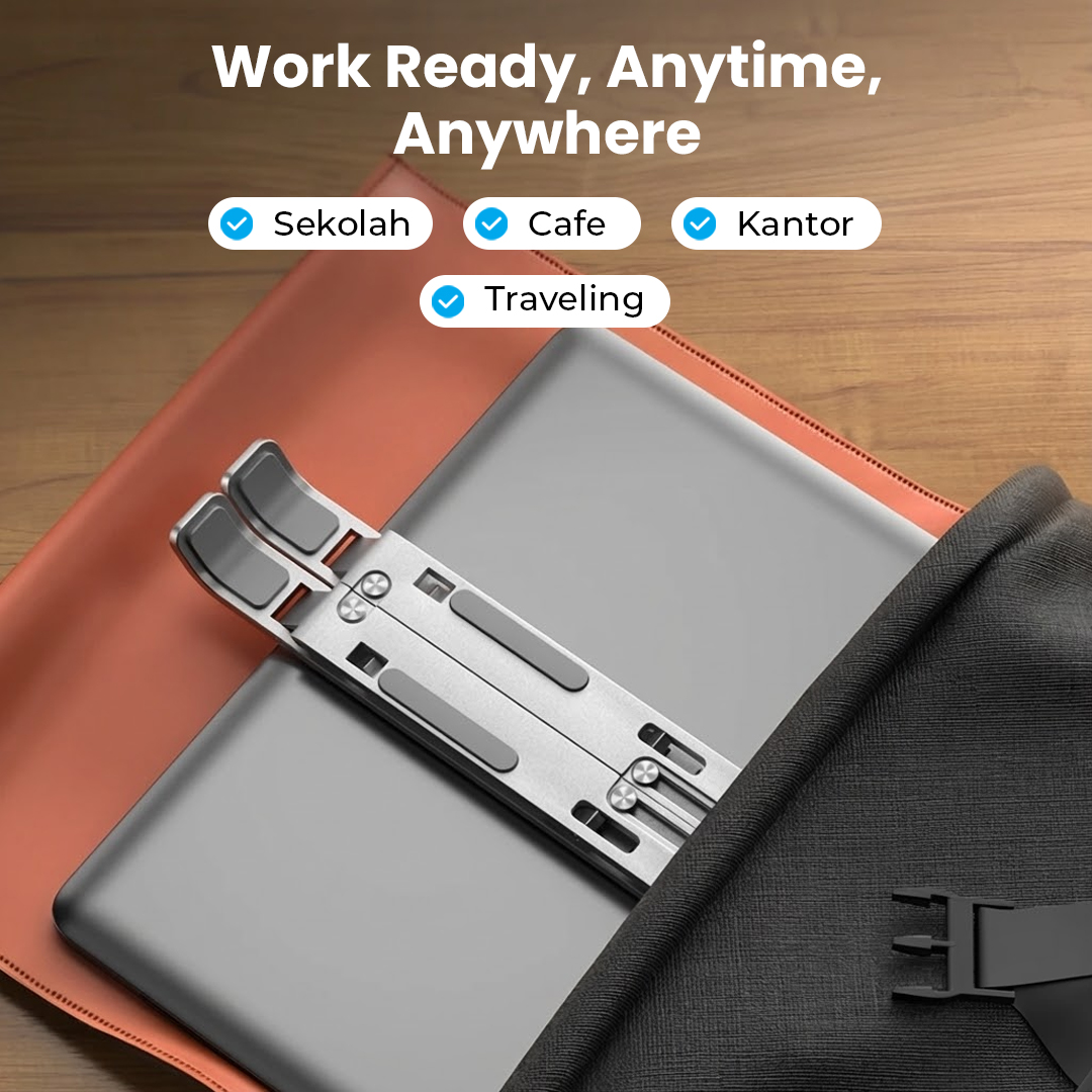 | Bawa dan Gunakan Kapan Saja Model lipat ringkas membuat laptop stand MC jadi perlengkapan kerja wajib saat WFA atau WFC. Bawa dan gunakan stand laptop untuk bekerja dengan nyaman kapan saja dan di mana saja. |