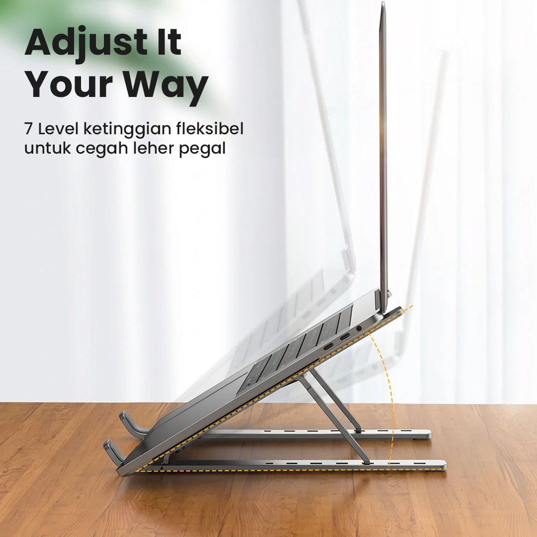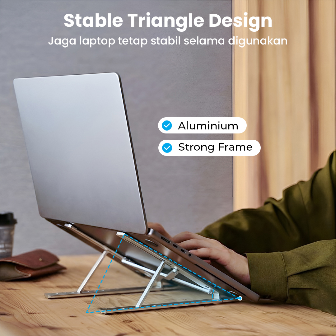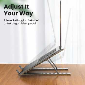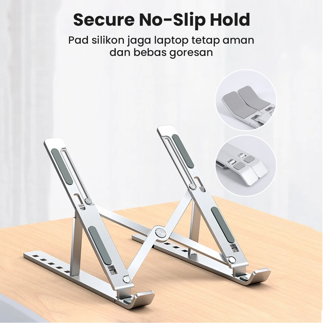 | Desain Ergonomis dan Stabil Desain ergonomis dengan kemiringan yang pas, pad silikon anti slip, dan material aluminium dapat menopang laptop dengan maksimal. Ini yang memastikan stand laptop tetap stabil. |