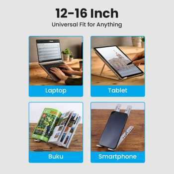 | Ukuran Universal untuk Semua Menawarkan ukuran universal, gunakan stand laptop untuk meletakkan berbagai barang. Mulai dari smartphone, tablet, buku, hingga laptop 16 Inch, semua bisa Anda letakkan di atas stand ini. |