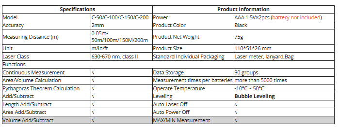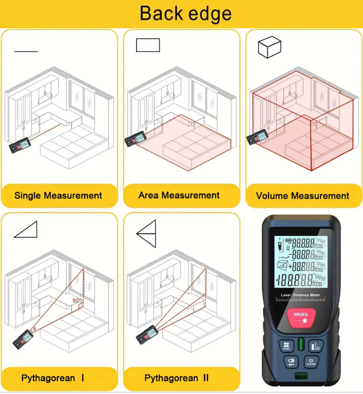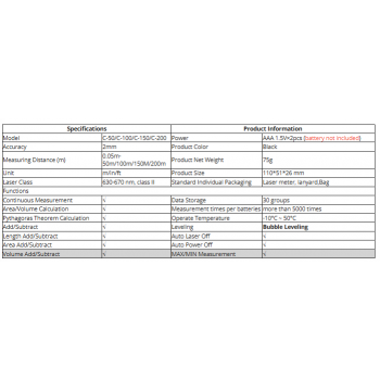 | Pilihan Rentang Pengukuran 50 M dan 100 M MEAS Laser Distance Meter tersedia dengan dua pilihan rentang pengukuran, yaitu 50 M dan 100 M, yang memungkinkan Anda untuk memilih rentang yang sesuai dengan kebutuhan pengukuran Anda, baik untuk proyek kecil maupun besar. |