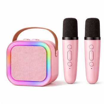 Speaker bluetooth karaoke portable MEODY K12 dengan desain mini, 2 mic wireless, suara jernih, lampu RGB, dan baterai 18650 tahan hingga 5 jam, cocok untuk hiburan di rumah maupun dibawa ke mana saja, tersedia warna pink & putih. Praktis digunakan dengan koneksi Bluetooth, USB, dan TF card untuk berbagai sumber audio.