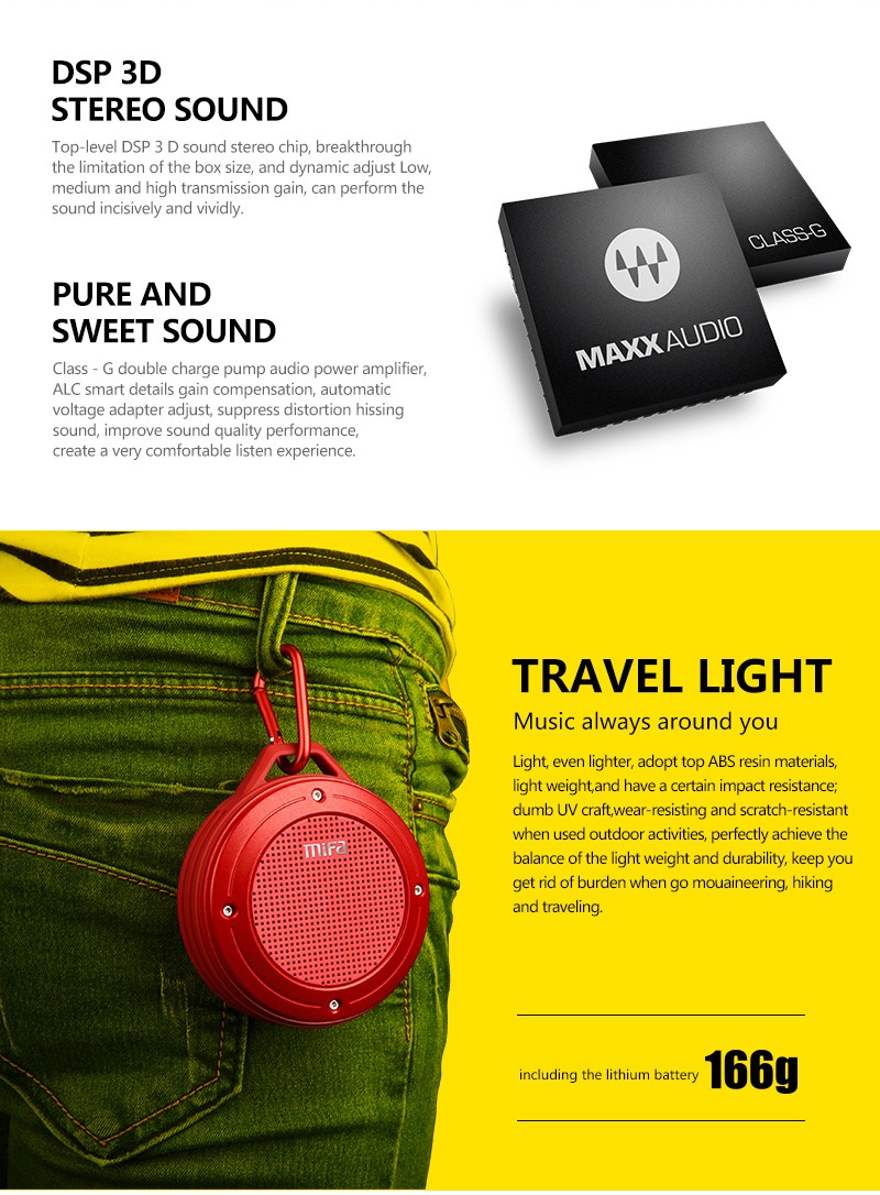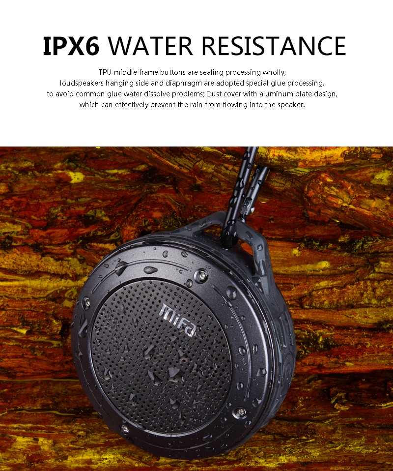 Speaker MIFA F10 ini memiliki pengait atau carabiner untuk menggantung speaker di tas, tali pinggang dan tempat lainnya. Teknologi waterproof dan desain body yang tangguh membuat speaker ini cocok dibawa berpetualang, camping dan kegiatan outdoor lainnya.
