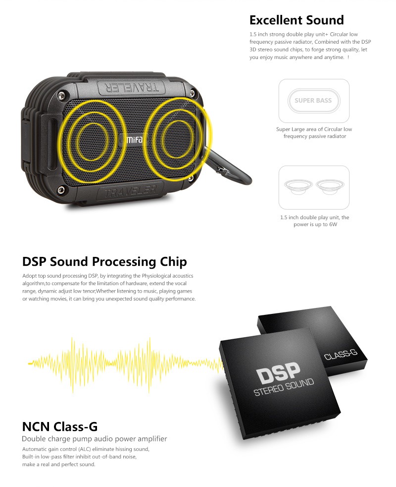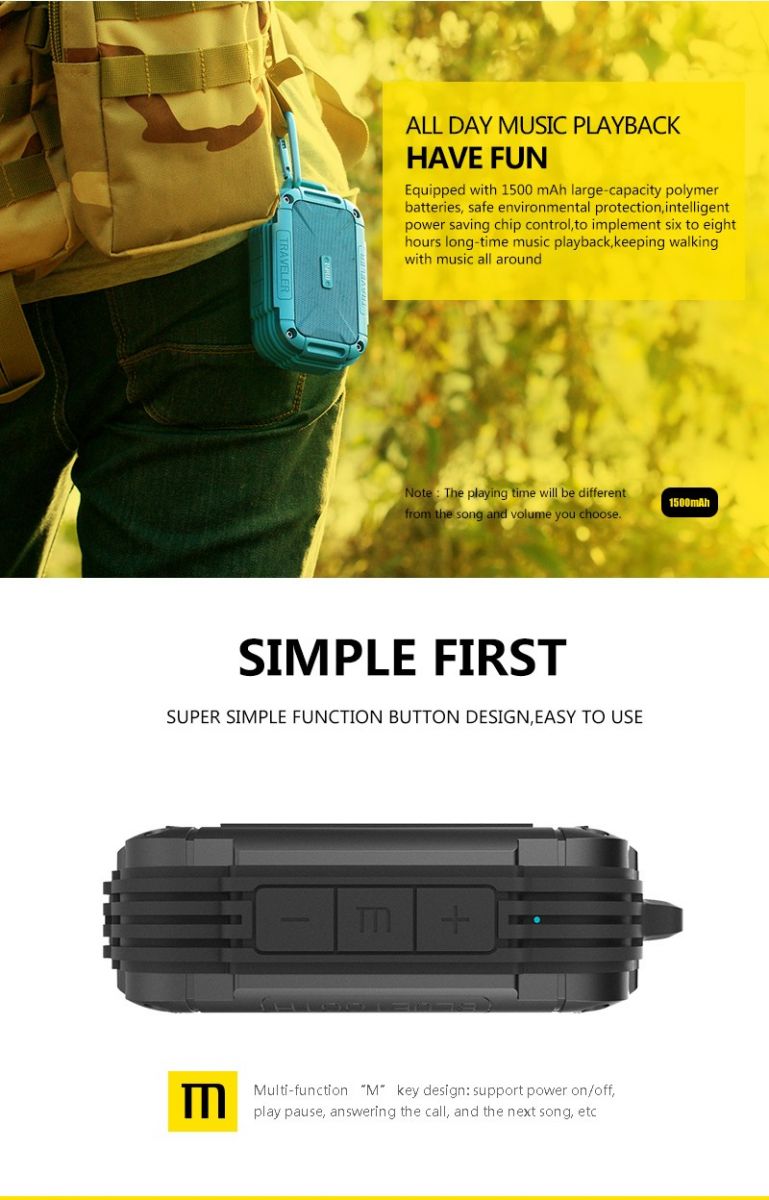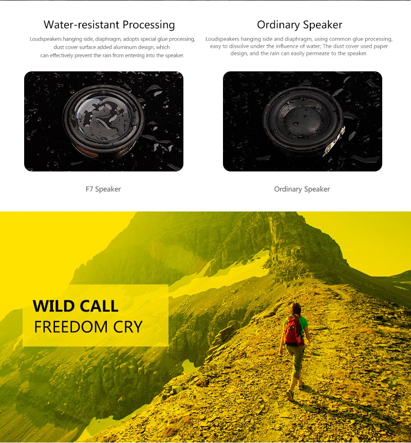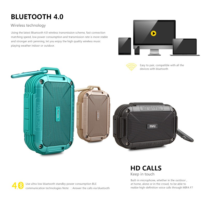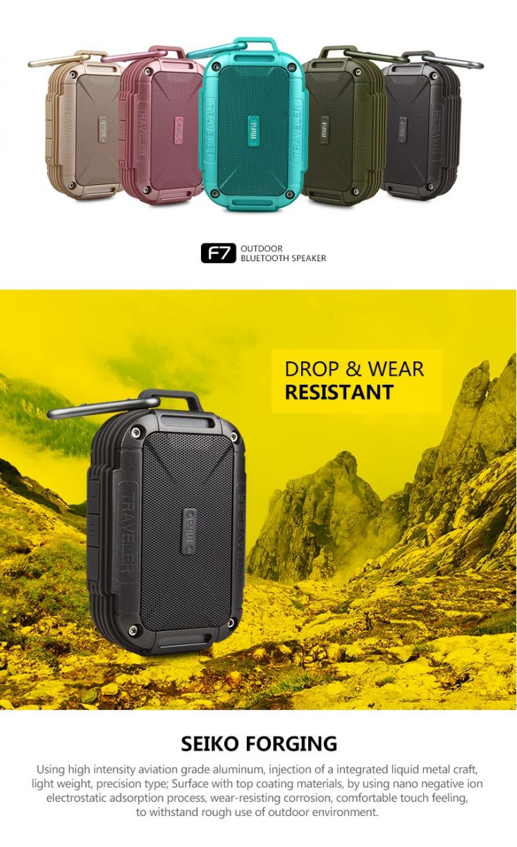 Speaker MIFA F7 ini memiliki pengait atau carabiner untuk menggantung speaker di tas, tali pinggang dan tempat lainnya. Teknologi waterproof dan desain body yang tangguh membuat speaker ini cocok dibawa berpetualang, camping dan kegiatan outdoor lainnya.