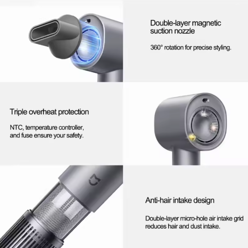 | Rotasi Nozzle 360 Derajat Sebuah nozzle yang dapat dilepas-pasang juga hadir untuk memfokuskan arah udara panas demi meminimalisir risiko kulit kepala terbakar. Nozzle ini mengadopsi komponen magnetik sehingga dapat berotasi secara 360 derajat sesuai arah hembusan angin yang Anda inginkan. |